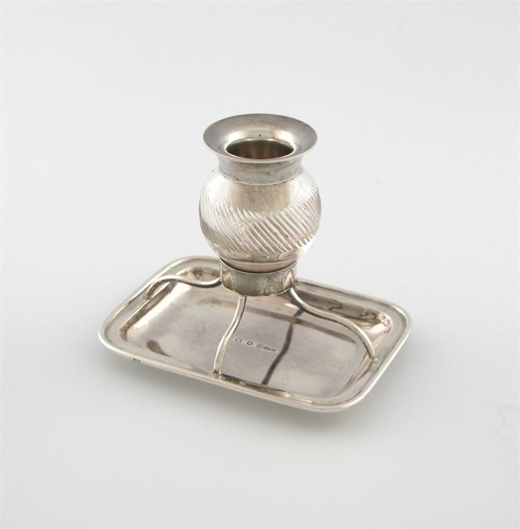 the globular glass striker with etched decoration, plain silver mounts, supported by four wire-work scroll arms on a shaped rectangular base, length 10.8cm.