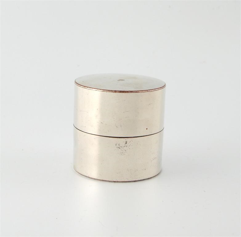 cylindrical form, with a pull off cover and base, and engraved with a crest, gilded interior, the outer old Sheffield case also with a gilded interior, height 7cm.