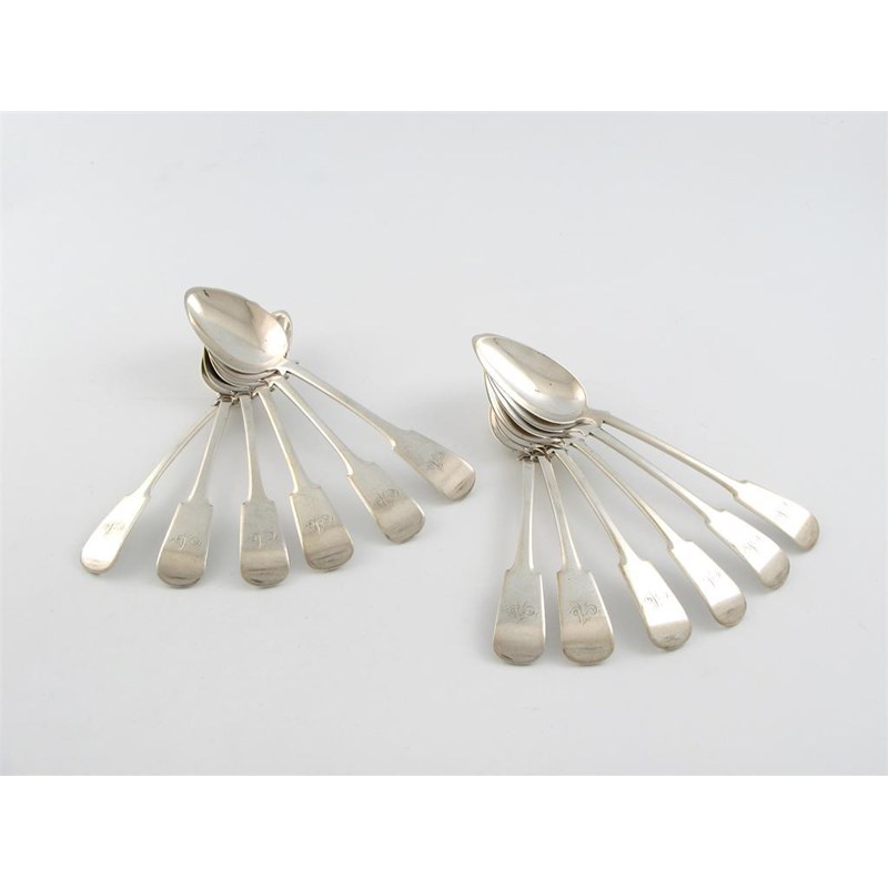 A set of twelve early 19th century Scottish provincial silver Fiddle pattern dessert spoons,