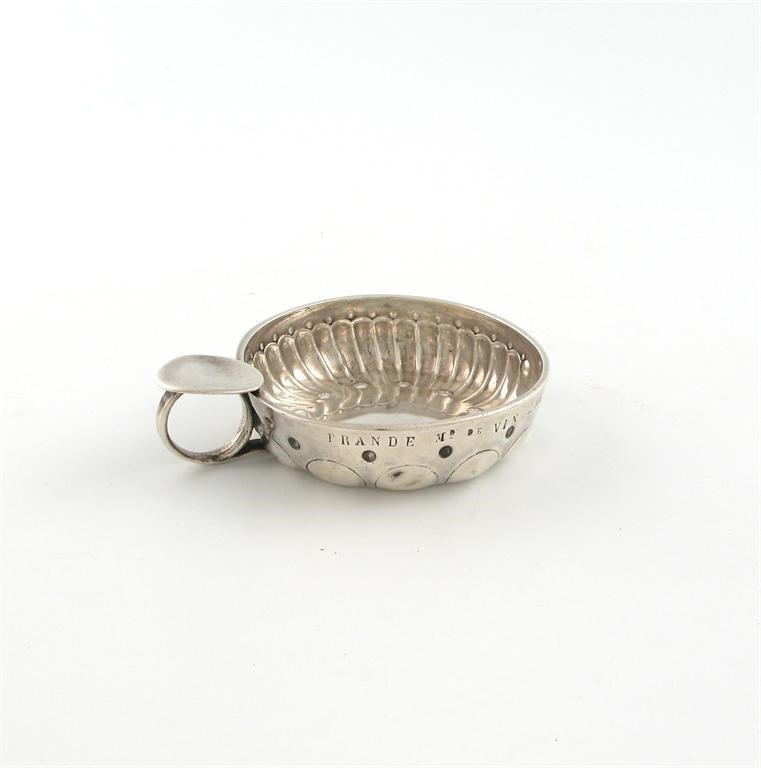 circular form, part fluted decoration, ring handle with a plain thumb-piece, inscribed 'FRANDE MD DE VIN NEUVIS' diameter 7.8cm, approx. weight 4oz.