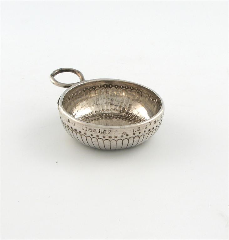 circualr form, part fluted decoration, snake ring handle, inscribed 'H.H. CLIMATE', diameter 7.6cm, approx. weight 2oz.