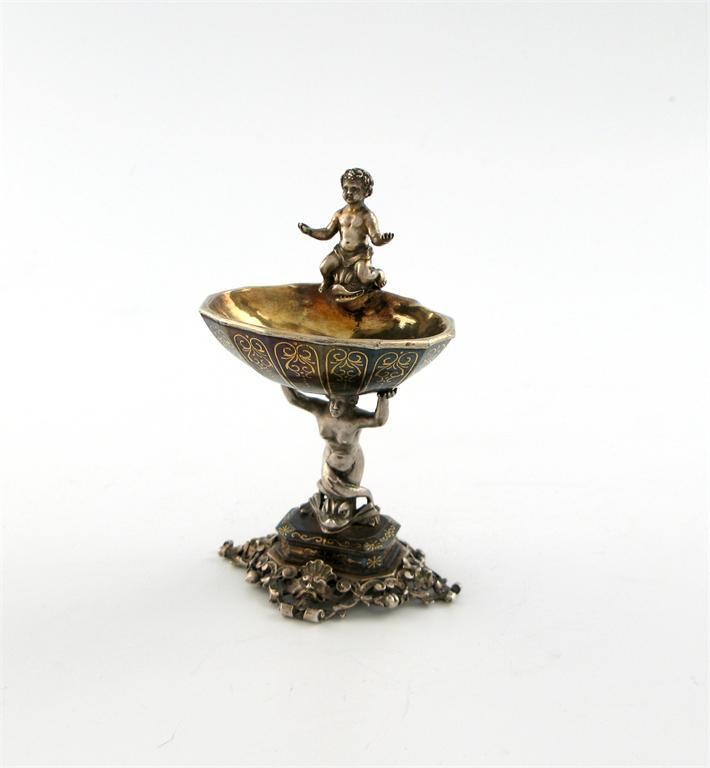 the shell shaped bowl with a gilded interior and mounted with a cherub sitting on a mythical dolphin, the bowl supported by a mermaid sitting on a dolphin, the whole on a pierced shaped lozenge foot, height 11.5cm.
