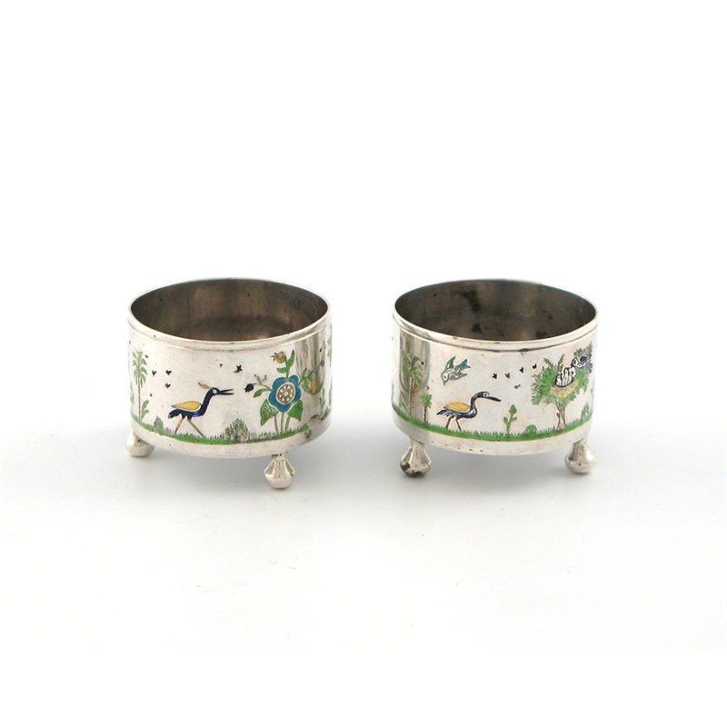 circular form, enamelled with birds in landscape settings, also inscribed in Arabic text, diameter 4cm. (2)