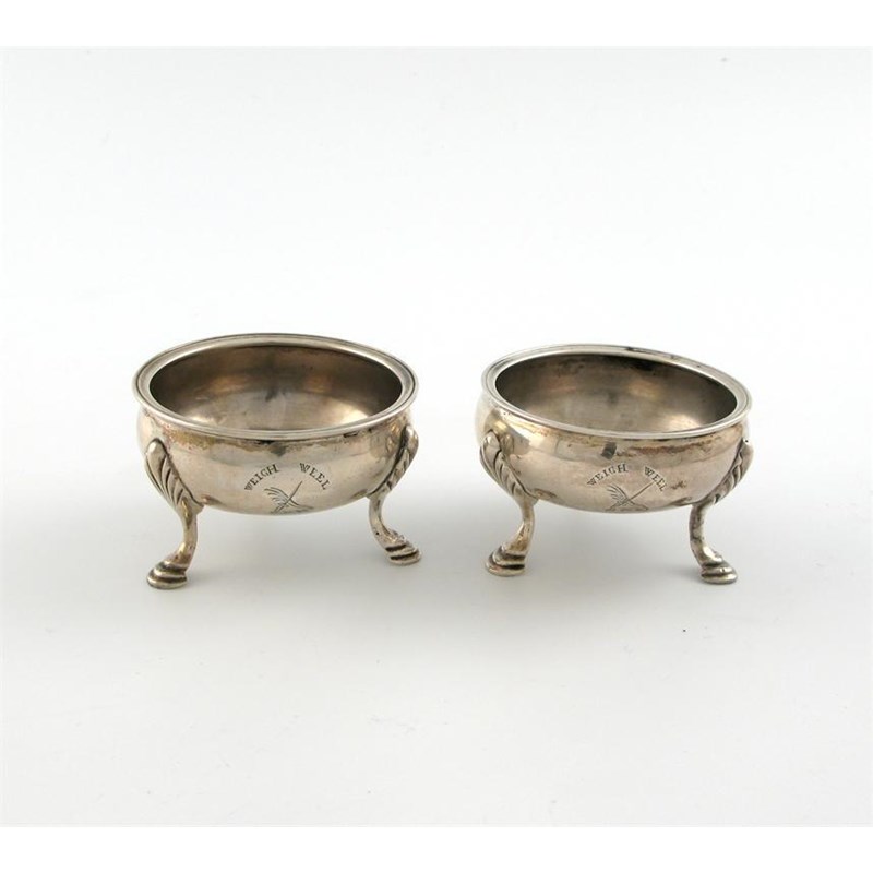 cauldron form, on three shell capped hoof feet, engraved with a crest and motto, diameter 6cm, approx. weight 3oz. (2)