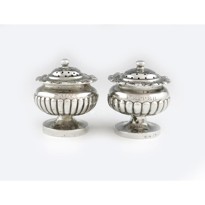 circular form, part-fluted decoration, foliate borders, the pierced pull-off covers with a ball finial, inscribed 'SALT' and 'PEPPER', on a raised circular foot, height 7.2cm, approx. weight 9.5oz. (2)