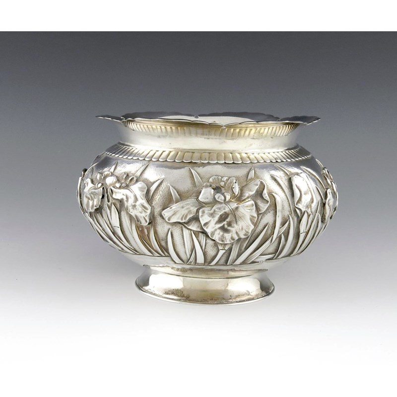 circular form, embossed with lilies on a matted background, on a raised circular foot, diameter 16cm, approx. weight 24oz.