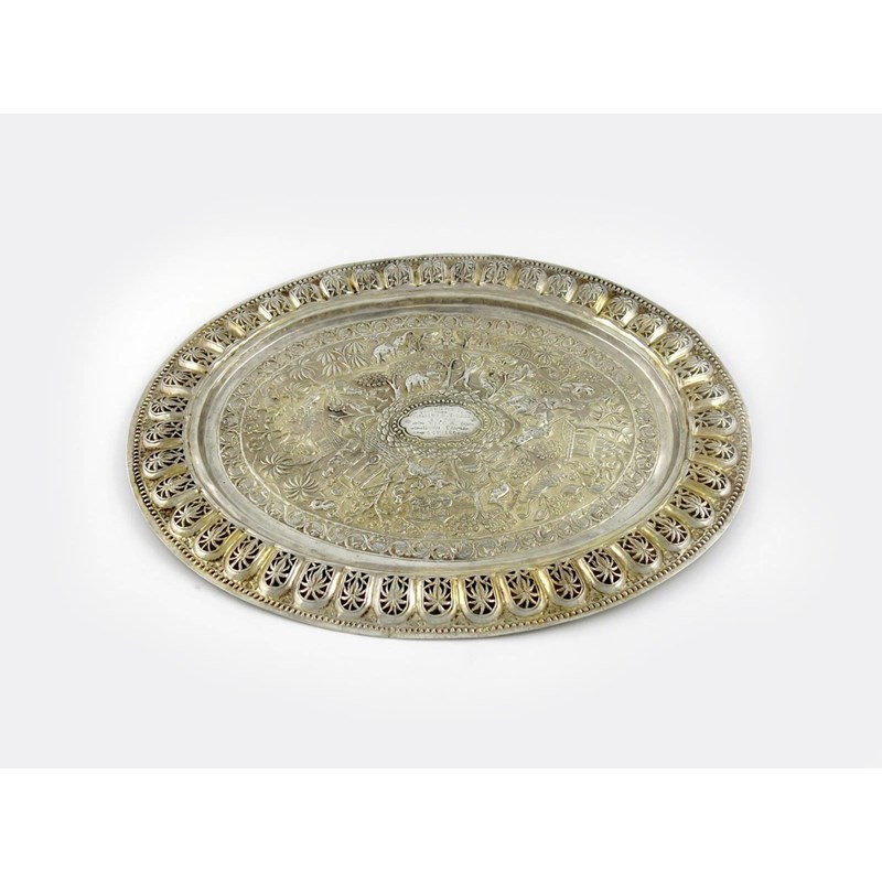 oval form, 'Vignette pattern', pierced border, the centre inscribed 'Presented to Mr and Mrs R.B. Young by the Y.M.C.A. Naina-Tal October 1920', length 40cm, approx. weight 16.7oz.