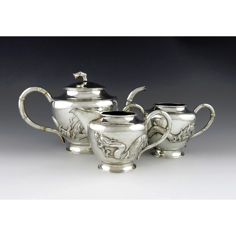 tapering circular form, applied with dragons, simulated bamboo scroll handles and spout, on a raised circular base, length handle to spout 24.5cm, approx. weight 30oz. (3)