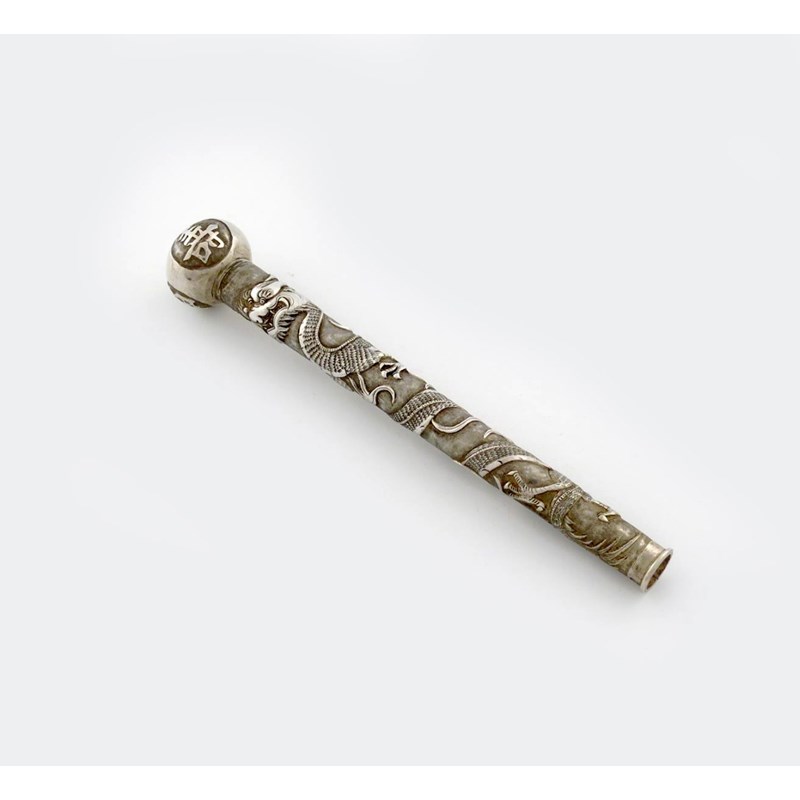 tapering circular form, embossed with a dragon on a matted background, the finial with Chinese letters, length 21cm, approx. weight 2.5oz.