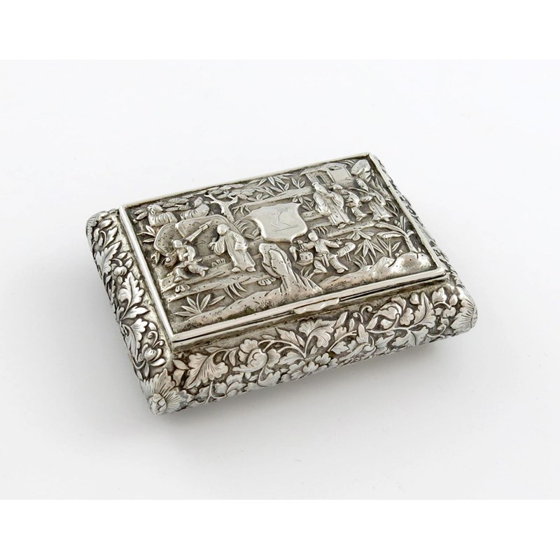 rectangular form, cushioned sides with foliate decoration on a matted background, the hinged cover with a figural scene in a foliate background, with a shield cartouche, engraved with a crest, the base engraved with a bird, length 11.2cm, approx. weight 7oz.