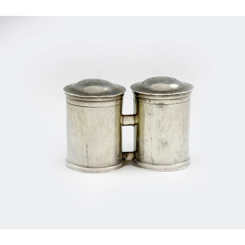 modelled as two joined cylindrical pots with hinged covers, one inscribed 'S.C', the other 'Ol.Sal' height 4.5cm, approx. weight 2.5oz.