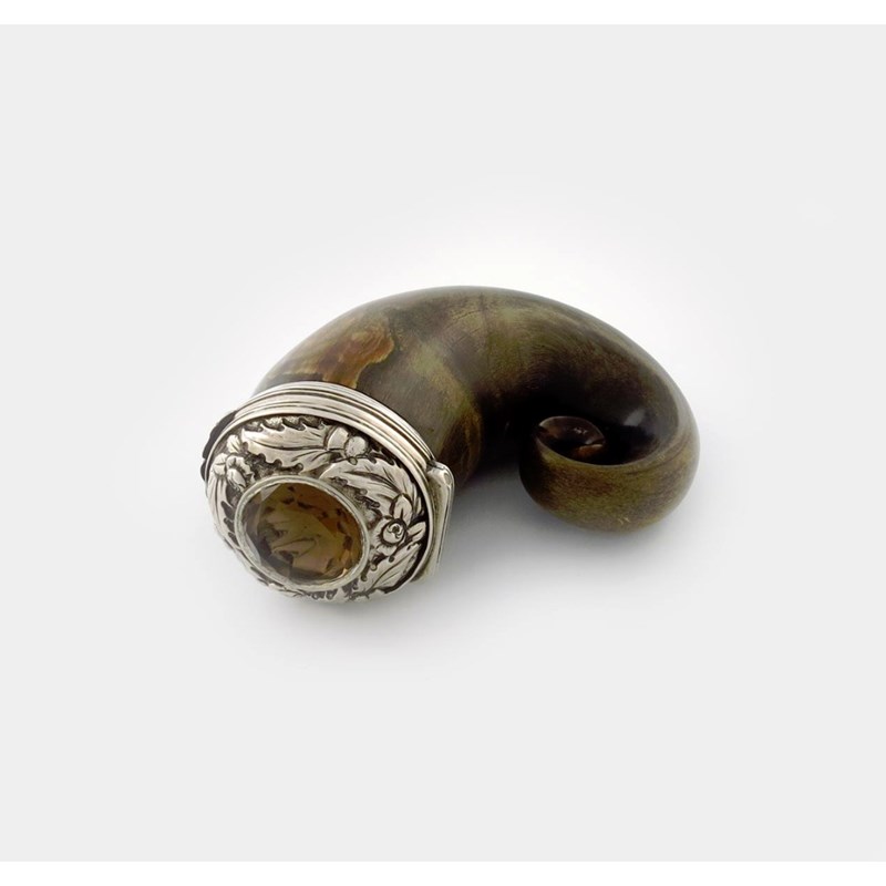 the hinged cover with embossed thistle decoration and set with a citrine, length 9.5cm.