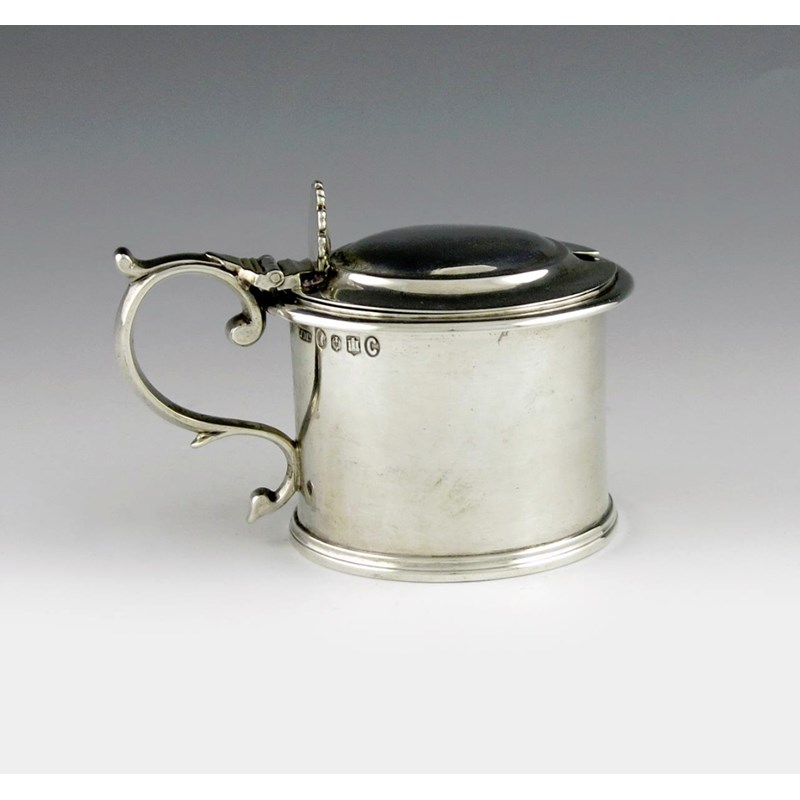circular form, scroll handle, the hinged cover with a shell thumb-piece, with a blue glass liner, height 6.5cm, approx. weight 3.9oz.