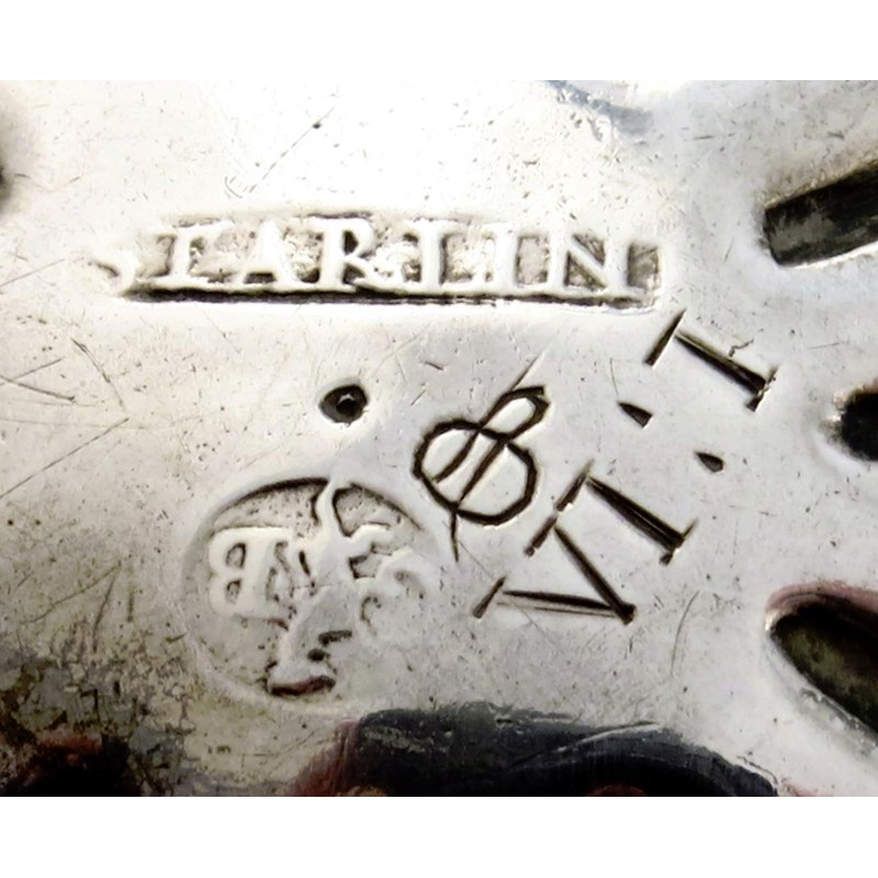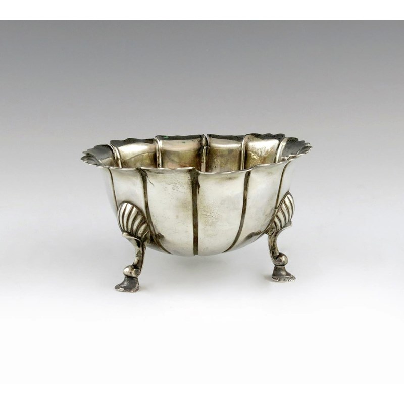 circular fluted form, wavy-edge border, on three shell capped scroll feet, terminating in feather-edge pads, the underside scratch initialled 'I : IA' , and also with a monogram, splits, diameter 12cm, approx. weight 5.5oz.