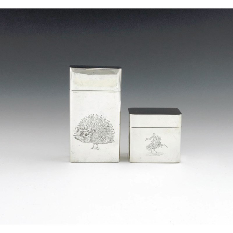 rectangular form, pull-off cover, gilded interior, engraved with a huntsman, a fox, a stag and two hounds, height 5cm, plus a modern silver cigarette case, London 1979, rectangular form, pull-off cover, wood lined, the front engraved with a peacock, height 9.4cm, approx. weight 6oz. (2)