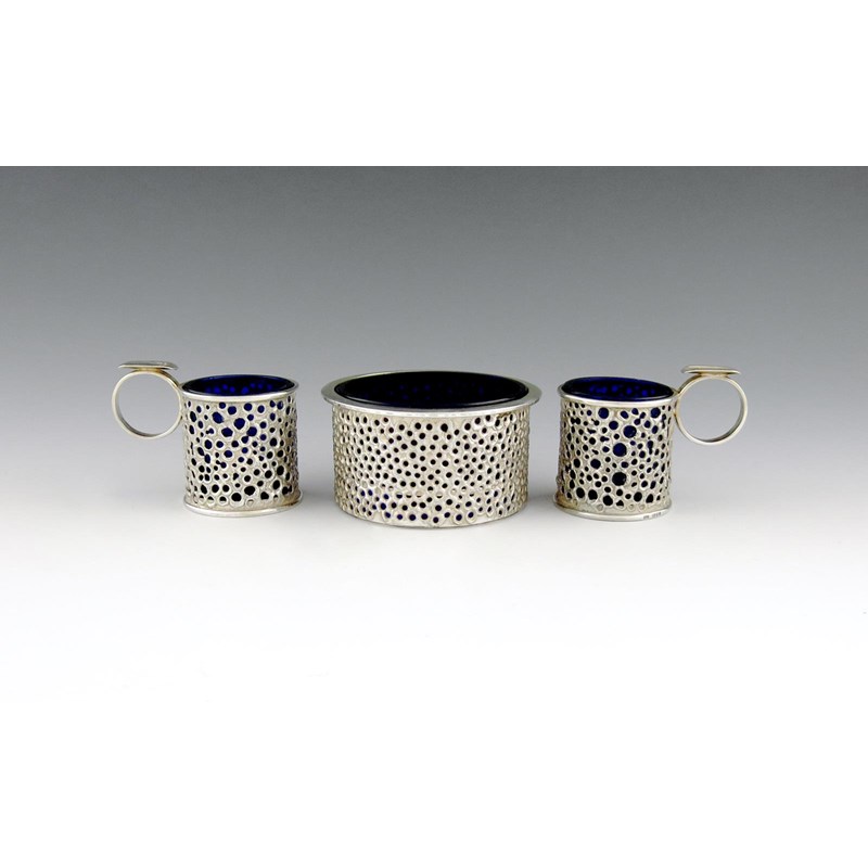 circular form, pierced and textured decoration, with a blue glass liner, diameter 9cm, plus a pair of modern silver ashtrays / serving pots, of similar design, height 6cm, approx. weight 8.5oz. (3)