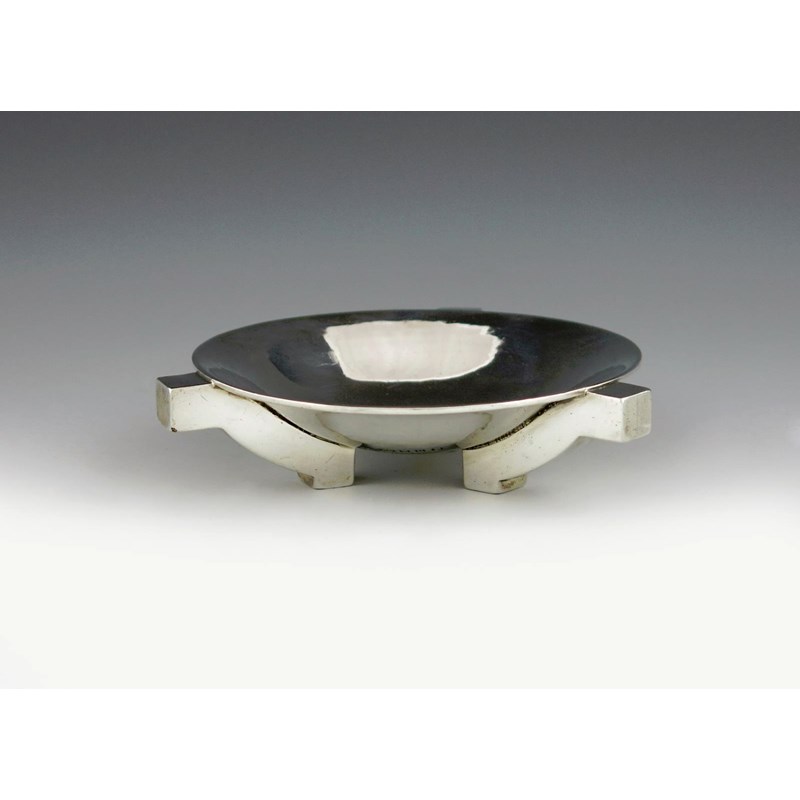 shallow circular form, with three geometric legs, diameter 11.5cm, approx. weight 6.3oz.