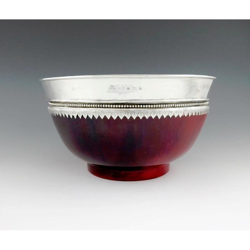 An Edwardian Arts and Crafts silver-mounted flambé glaze mazer bowl