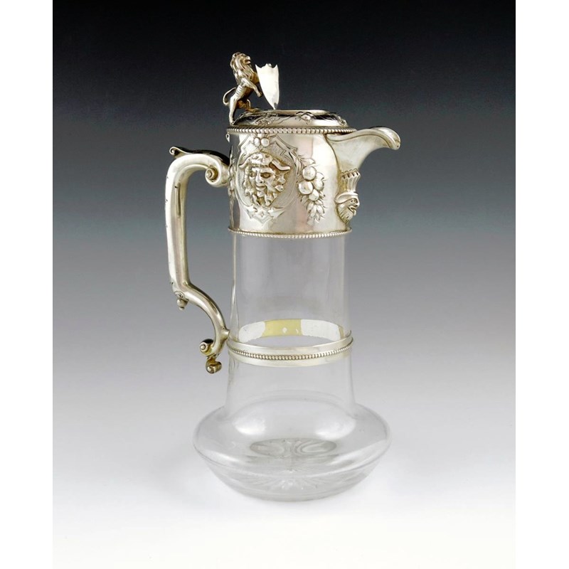 tapering and circular bellied form, the mounts with masks and fruiting decoration with bead borders, angular handle, the cover mounted with a rampant lion holding a shield, height 28cm.