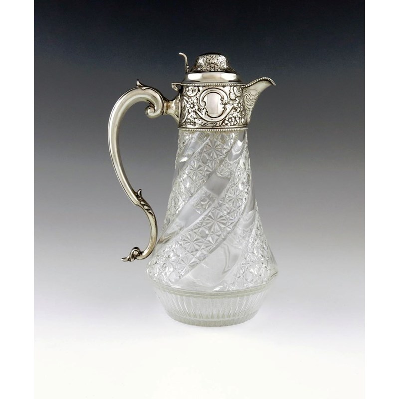 tapering glass circular body with swirled cut glass banding, the mount with embossed foliate decoration and vacant cartouches, scroll handle, height 25.5cm.