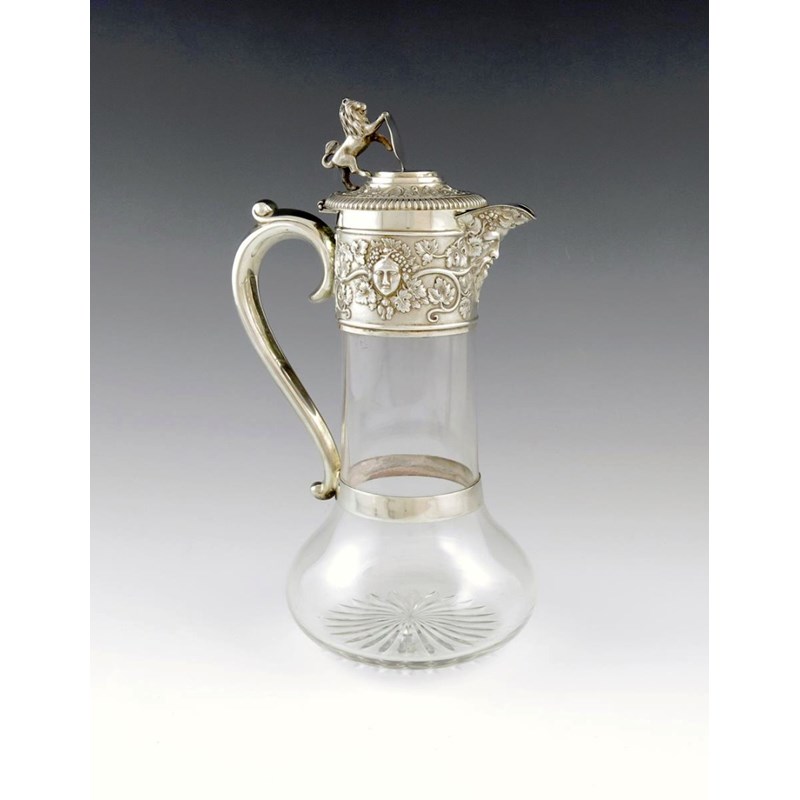 plain tapering and bellied form, the mounts decorated with scrolling vines and masks, scroll plain handle, the cover mounted with a rampant lion holding a shield, height 28.3cm.