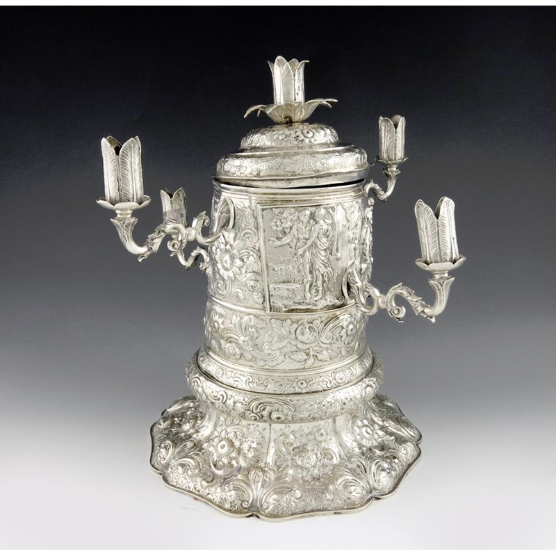 the tapering circular body applied with a figural relief panel, and embossed with foliate scroll decoration, pull-off cover with a loose finial, the detachable scroll branches with leaf capitals, on a detachable spread circular foot, height 35cm, approx. weight 96oz.