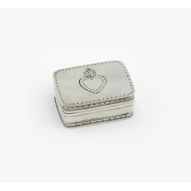 rectangular form, the hinged cover engraved with a heart, engraved borders, the interior with a silver-gilt grille pierced with a building and foliate decoration, length 3.5cm, approx. weight 0.6oz.