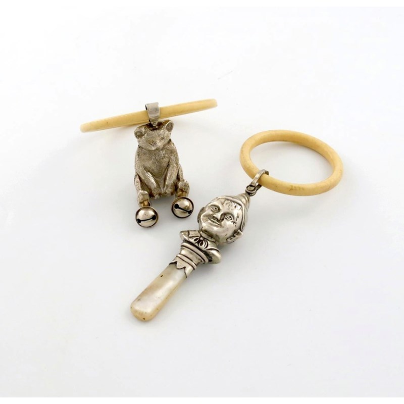 modelled as a seated bear, with two bells and a ring attachment, plus another silver baby's rattle modelled as the head of a pixie, Birmingham 1936. (2)