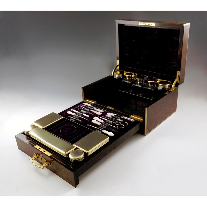 with plain matted mounts, plain and faceted glass bodies, comprising: three scent bottles, four toilet jars and three toilet boxes, plus two pairs of scissors, and ten mother-of-pearl handled items including a pen knife, button hook and manicure pieces, and three other items, in a brass bound burr walnut case with pull-out concertina front, and with two inner pull-out drawers, the interior of the lid with a mirror and stationery wallet, with a leather storm jacket, length of case 30.8cm, approx. weighable 10oz.