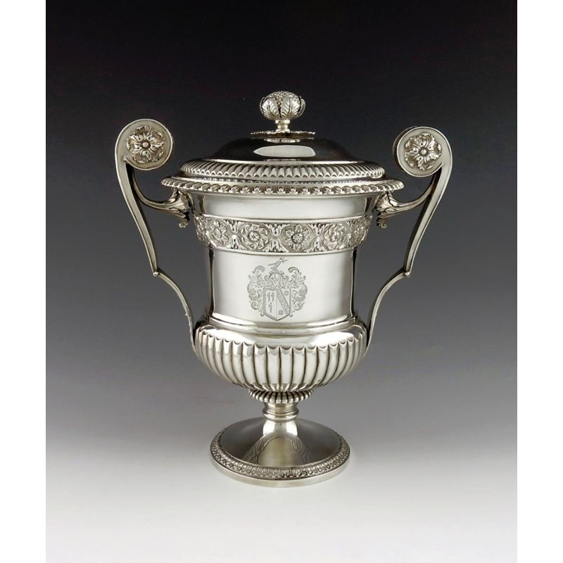 campana shaped body, part-fluted decoration, scroll handles with rosettes, part-fluted domed cover with a cauliflower finial, on a raised circular foot with a leaf border, engraved with an armorial within foliate scroll mantling, height 31cm, approx. weight 59.3oz.