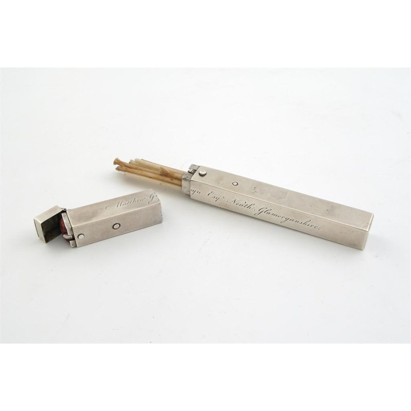 An unusual George III sealing wax and taper holder, separating into two sections (one with a hinged cover), inscribed 'Matthew Gwyn Esq. Neath, Glamorganshire', by T.Phipps & E. Robinson, London 1804, 7in (18cm) long.