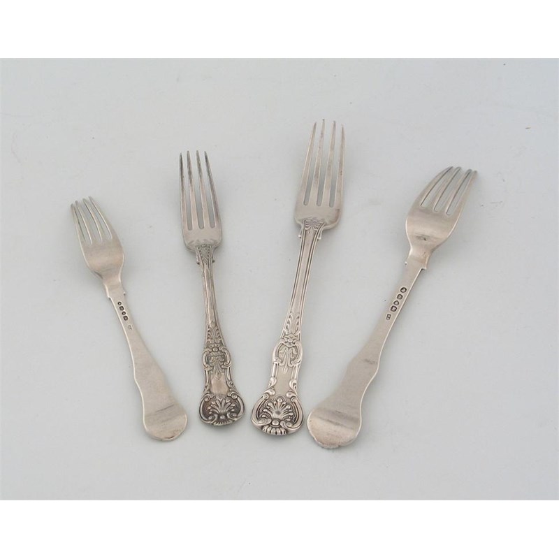 A set of 6 Victorian tableforks and 5 dessert forks, (single struck) Queens pattern, by Francis Higgins, London 1845/46, 24oz. (12) and a plated dessert fork to match, 23oz weighable silver.