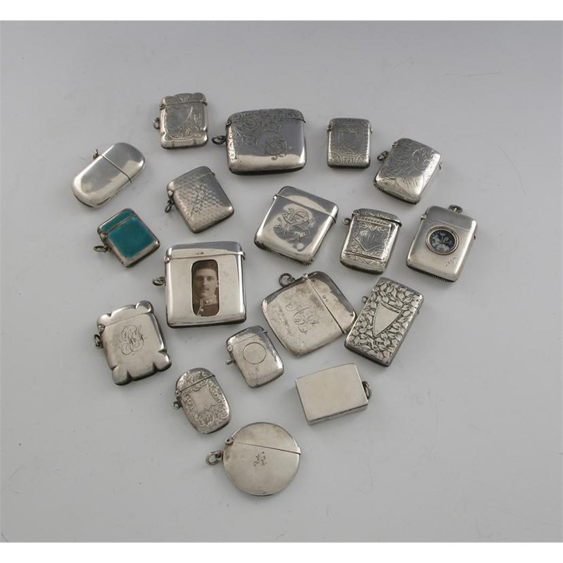 A collection of assorted vesta cases, including various engraved examples, a vesta inset with a compass, a German vesta engraved 'Leipzig 1903', one with green enamelled decoration, mixed makers and dates, Victorian to modern, 16oz. (18)
