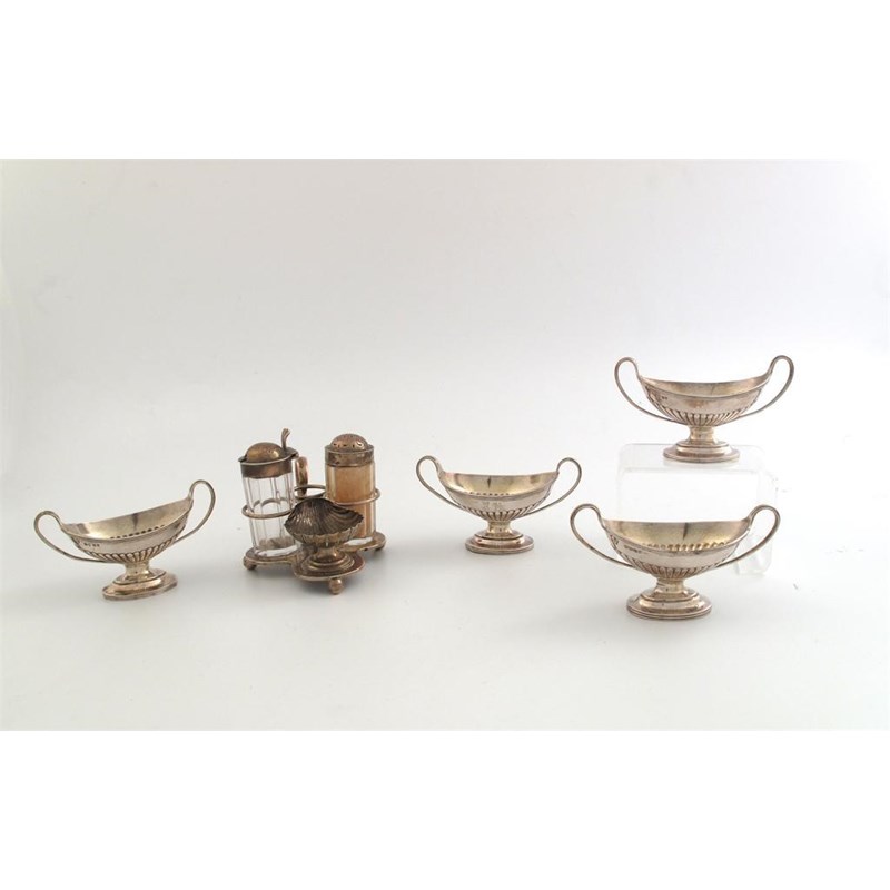 A mixed lot: a set of four boat shaped salts with loop handles, part-fluting and two crests, by Charles Stuart Harris, London 1883, and a Victorian cruet with two mounted glass bottles by London 1875, the latter 5in (12.8cm) long, 10oz weighable silver.