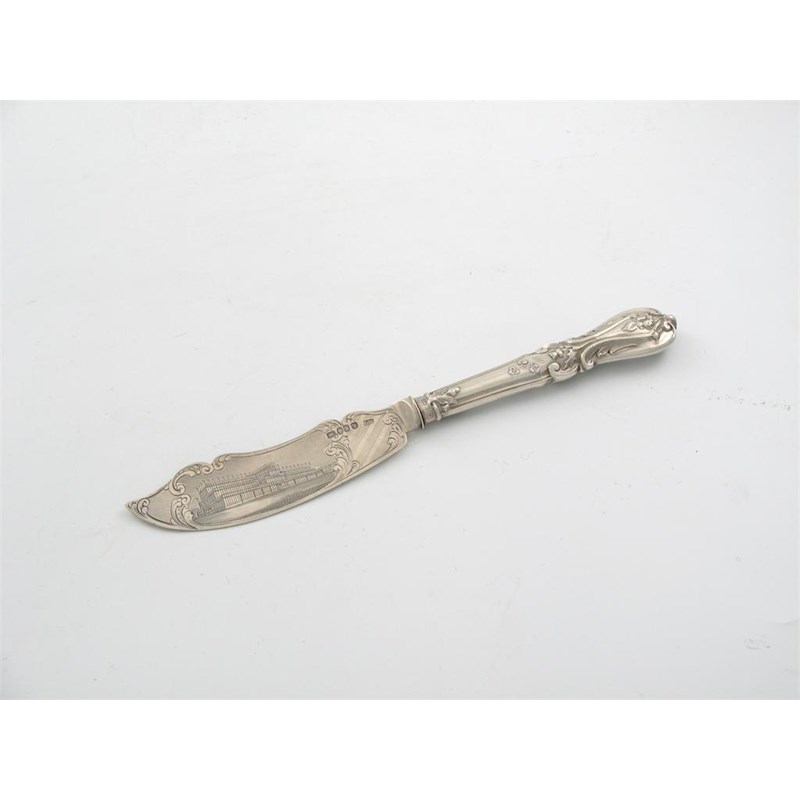 Crystal Palace: a Victorian butter knife, the blade engraved with a view of the crystal palace, by George Unite, Birmingham 1850, the loaded floral handle, Sheffield made, 8.2in (20.5cm) long.