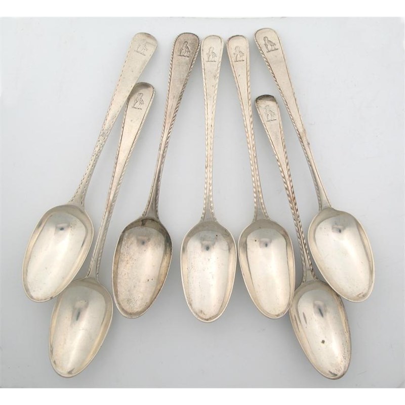 Seven various George III feather edge dessert spoons, all crested to match, mixed makers, London 1765-75, 7.5oz. (6)