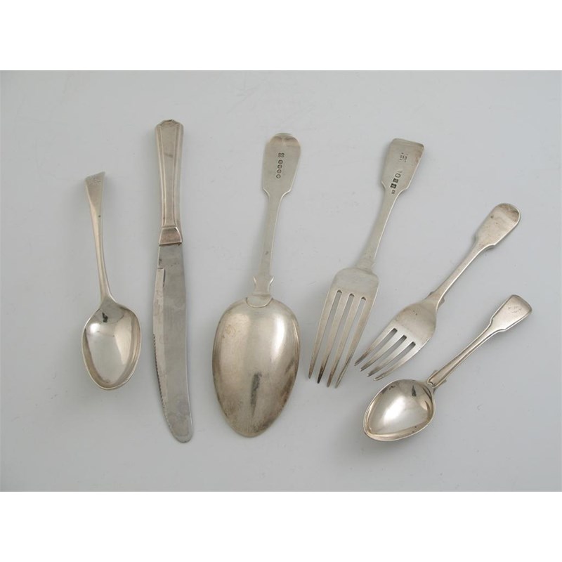 Miscellaneous flatware: a set of six George III fiddle and thread teaspoons, initialled 'G', by W. Eley & W. Fearn, London 1816, an Exeter fiddle tablespoon, seven tableforks (including four Irish), three dessert spoons, and seven dessert forks, and twelve plated knives, 34.5oz weighable silver. (36)