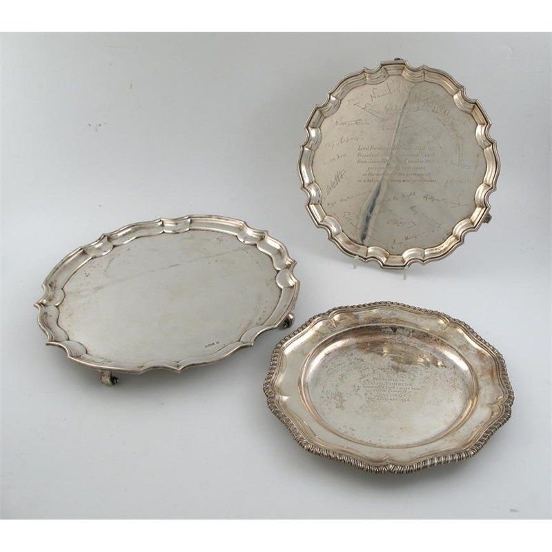 A modern salver, shaped circular on scroll feet, by J & W Deakin, Sheffield 1915, another smaller example, inscribed, and a George III dinner plate, inscribed, the larger salver, 12in (30.5cm) diameter, 61oz. (3)