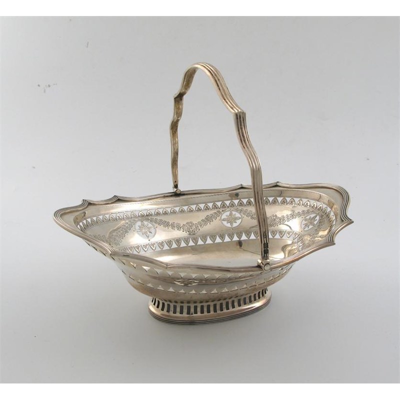A late Victorian swing-handled basket, with pierced sides and bright engraved interior, shaped reeded rim, by Charles Stuart Harris, London 1899, 9.3in (24cm) long, 11oz.