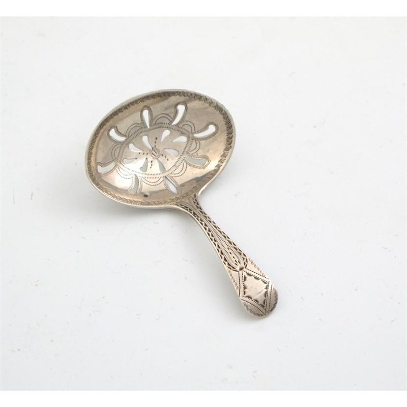 A George III bright cut caddy spoon, with a pierced bowl, by George Brasier, London 1795.