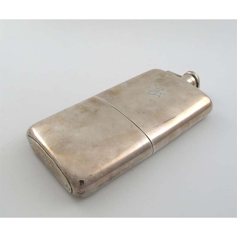 A large modern spirit flask, plain oblong, pull off cup, hinged, twist open cover, monogrammed 'JR', by James Dixon & Sons, Sheffield 1939, 10in (25.2cm) high, 24oz.