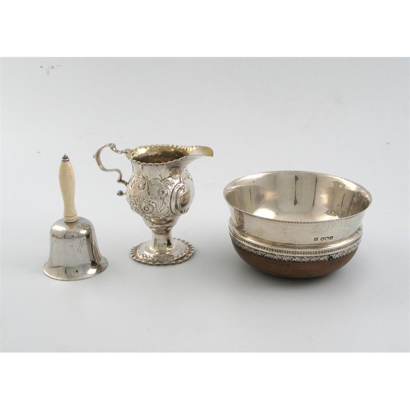 A modern small bell, with turned ivory handle, a modern mounted wooden mazer bowl and a George III embossed cream jug, by Nathaniel Appleton and Ann Smith, London 1774, the latter 4in (10cm) high, 2oz weighable silver. (3)