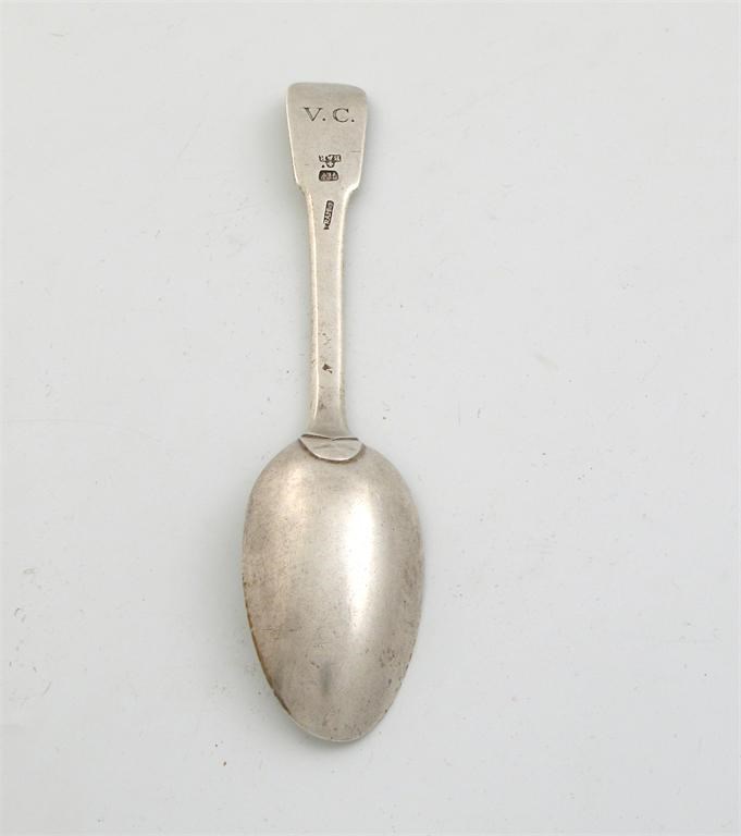 An 18th century Spanish fiddle tablespoon, initialled 'V.C', makers 'T. RAMUS', assay master 'R. ALTET', BARCELONA, last quarter of the 18th century, 2.5oz.
