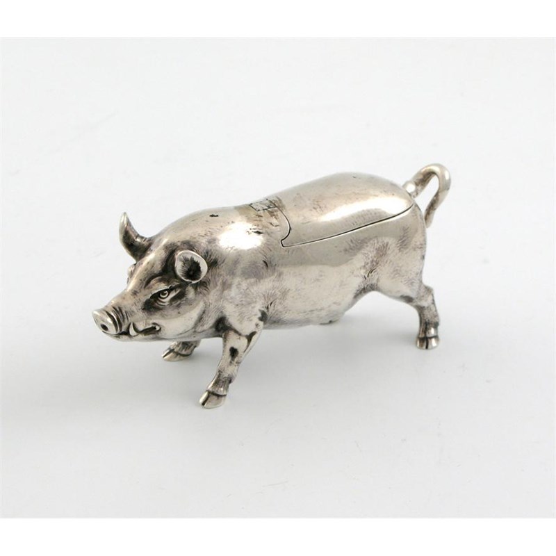 A rare Victorian novelty mustard pot, in the form of a boar, with textured hinged back and original spoon, the terminal forming his tail, by James Barclay Hennell, London 1880, 4in (10.1cm) long, 3.5oz. (2)