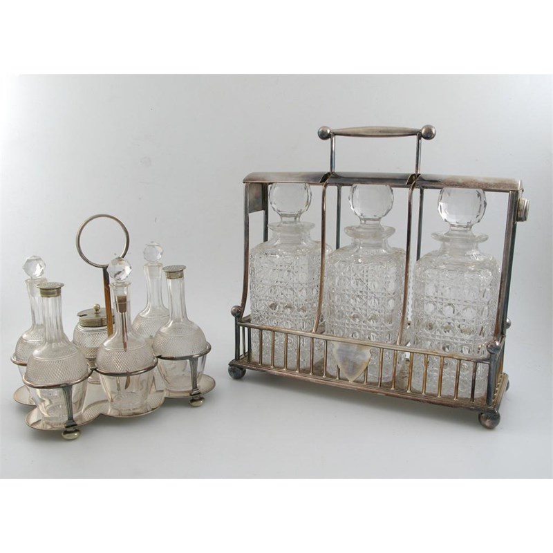 An electroplated tantalus fitted with three cut -lass, stoppered bottles, together with an electroplated six bottle cruet frame on a lobed base. (2)