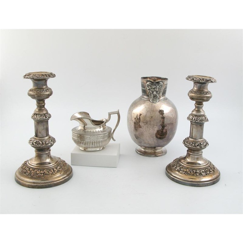Plated ware: a two handled tray, a pair of telescopic candlesticks, a jug, a pair of entree dishes and covers, a wine funnel, a spirit flask and a cream jug. (9)