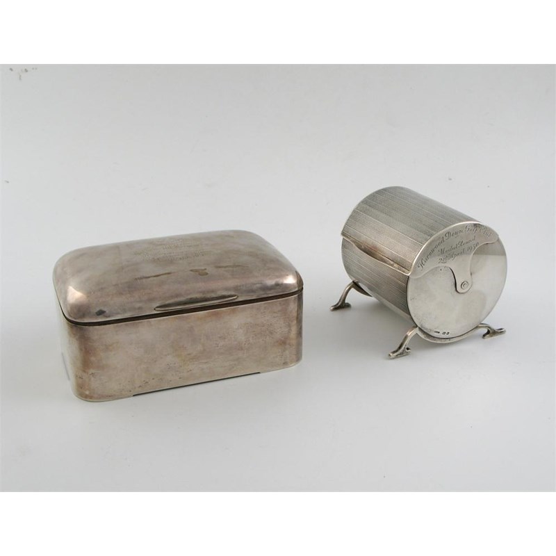 An Art Deco cylinder cigarette box, on four feet, with a pivoting cover and part engine turned decoration, gilt interior and a small inscription at each end, by Sampson Mordan & Co, London 1927 and an Edwardian cigarette box, rounded oblong, the cover engraved with a Royal Artillery badge and inscribed 'Presented to Capt J Forster by the Officers of the Devonshire R.G.A on the occasion of his marriage September 1917', wood lined, alson by S. Mordan & Co, London 1909, the former 3.6in (9.2cm) wide.