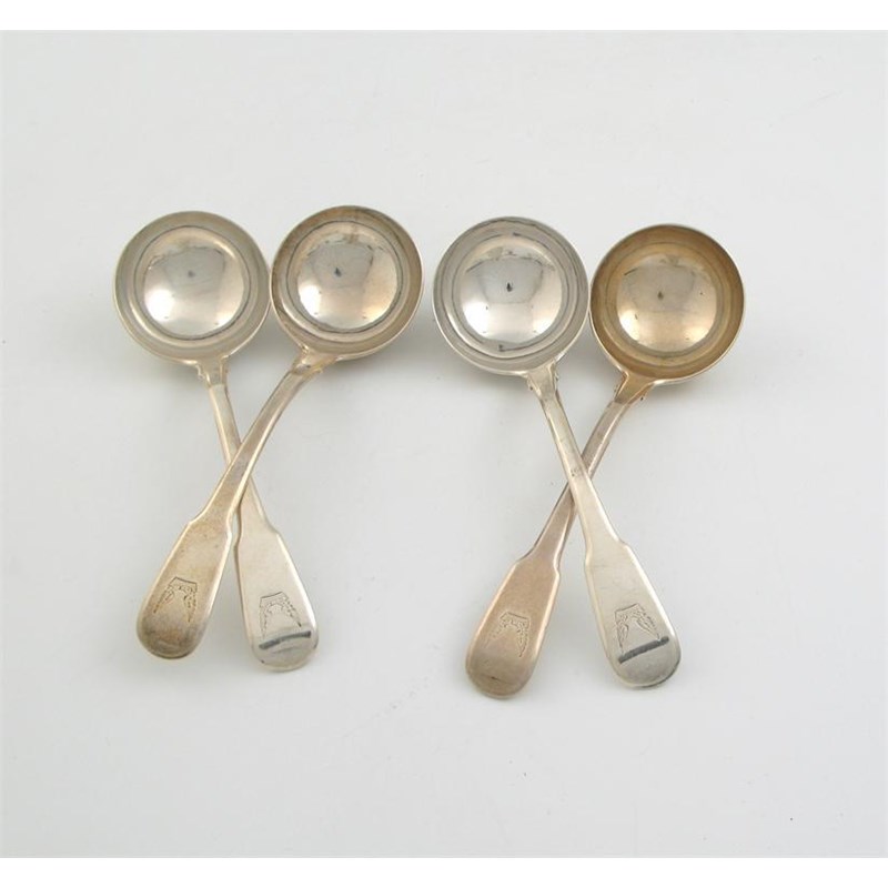 A set of four George III fiddle sauce ladles, crested by Messrs Eley Fearn and Chawner, London 1810, 8.5oz. (4)