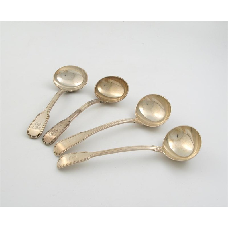 A pair of George fiddle and thread sauce ladles, crest and motto 'DEUS PROVIDENT', by George Piercy, London 1825 and two other antique, fiddle and thread saue ladles (one crested), 10oz. (4)