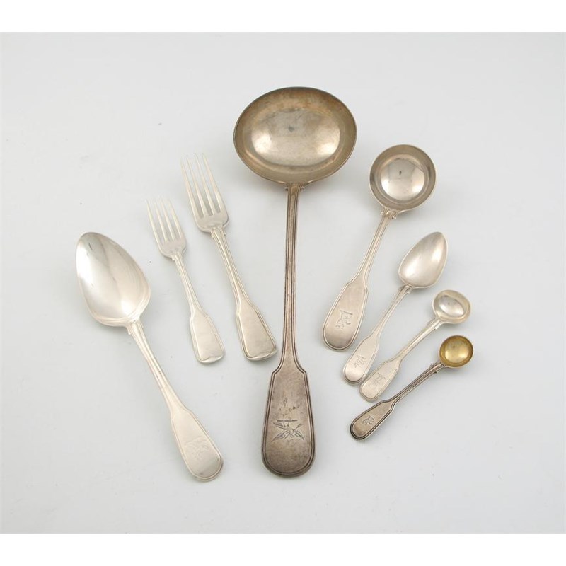 A quantity of antique fiddle and thread pattern flatware: a set of six tablespoons, crested, by R. Crossley and G. Smith, London, a set of six tablepoons, crested by W.Eley & W.Fearn, London 1805, a set of 7 tableforks, crested, by W.Eley & W.Fearn, London 1804, a set of six dessert forks, crested, by William Bateman, London 1822, fouteen various teaspoons, five various saltspoons, a pair of sauce ladles and a soup ladle, crested, 88oz. (49)